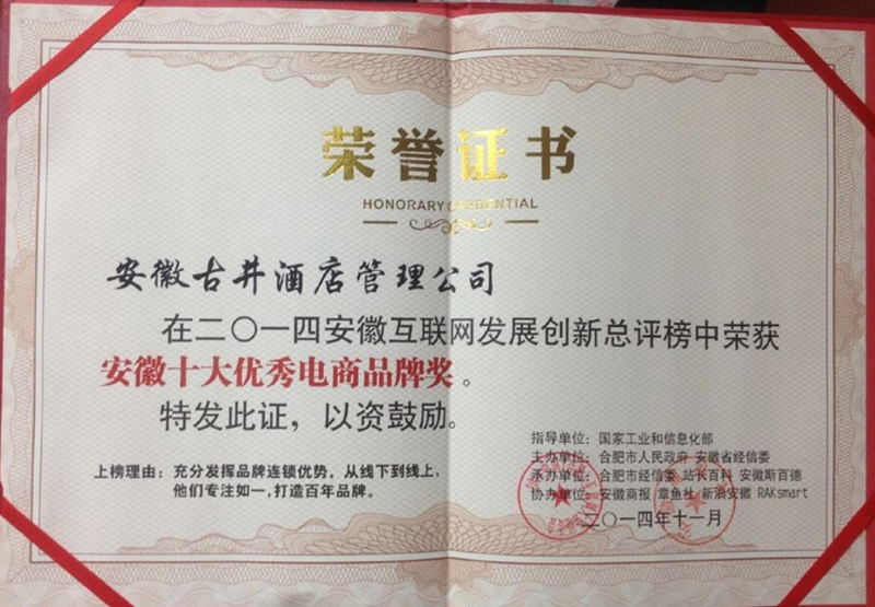 11月22日,2014中國(合肥)互聯(lián)網(wǎng)大會在合肥市政務(wù)中心會議隆重舉行,來自國內(nèi)外互聯(lián)網(wǎng)領(lǐng)域的領(lǐng)軍人物云集合肥。在共商全國互聯(lián)網(wǎng)發(fā)展理念與成果的同時(shí),為樹立安徽互聯(lián)網(wǎng)行業(yè)標(biāo)桿,打造中國互聯(lián)網(wǎng)“皖軍”品牌,本屆大會舉辦了首屆安徽省互聯(lián)網(wǎng)總評榜評選。經(jīng)網(wǎng)絡(luò)投票和專家評審,古井酒店管理公司脫穎而出,榮獲“安徽十大優(yōu)秀電商獎(jiǎng)”, 這也是安徽唯一獲此殊榮的酒店電商品牌企業(yè)。