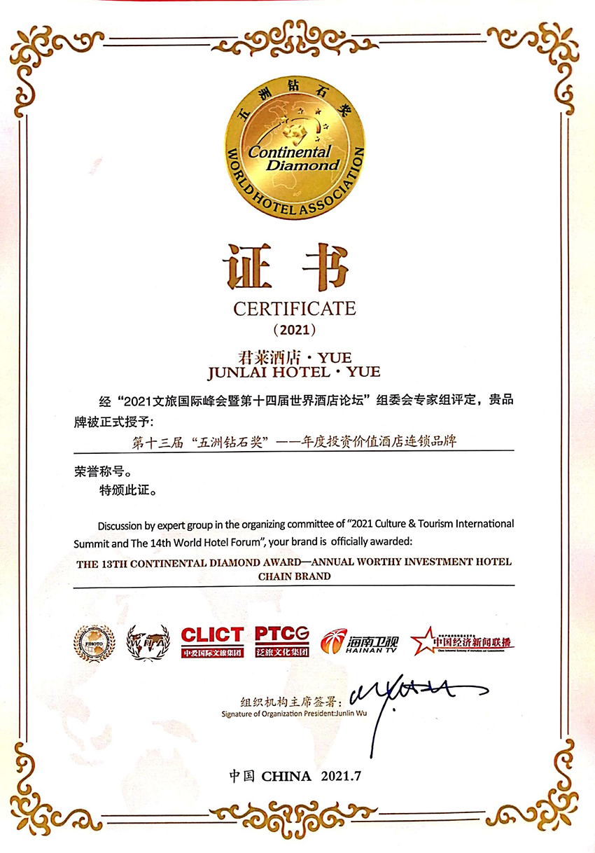 7月29-30日,“2021文旅國際峰會暨第十四屆世界酒店論壇”大會在??谂e辦,現(xiàn)場進(jìn)行了“五洲鉆石獎”頒獎儀式。作為城市新中端生活方式酒店的代表,公司旗下“君萊酒店·YUE”品牌榮獲“五洲鉆石獎·年度投資價(jià)值酒店連鎖品牌”。