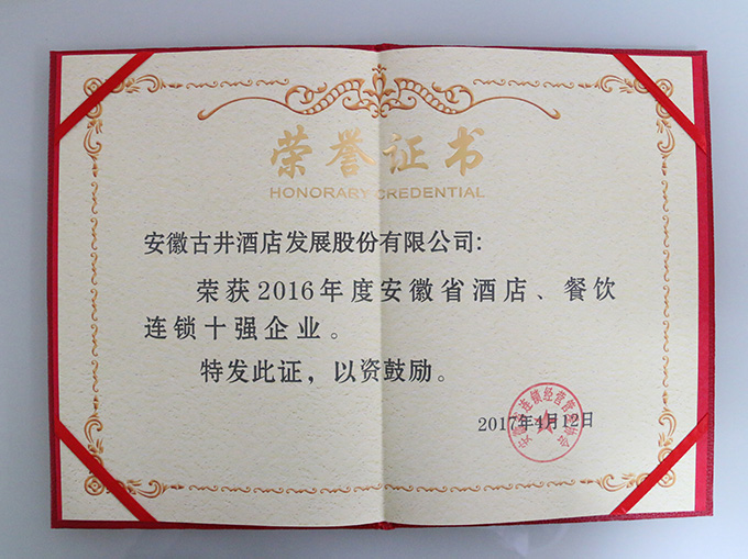 古井酒店發(fā)展股份公司獲評“2016年度安徽省酒店、餐飲連鎖十強企業(yè)”。